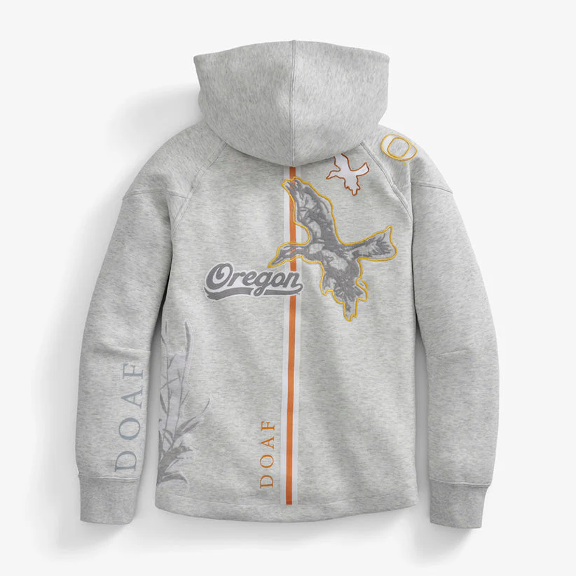 The Power of Flight jacket is inspired by the idea of leaving the nest and starting a new journey to shape the future. The duck in flight is the focal point, flanked by Oregon heritage marks. The color is rooted in tones of grey with highlights of Oregon yellow and golden hues. The oversized duck on the back of the garment is constructed from sheer fabric and embroidered with the duck sketch for a luxury, fashion aesthetic. Texture and layering is achieved with a mix of fabrics and applications. The stripe on the sleeve and back of the garment is a nod to collegiate uniforms. Fabric is stitched onto the garment and appears ribbon-like in application with a feminine, golden tone. The interior of the jacket features a stitched-in, jersey liner. Oversized Oregon and DOAF logos are nestled inside the landscape of a duck in flight.